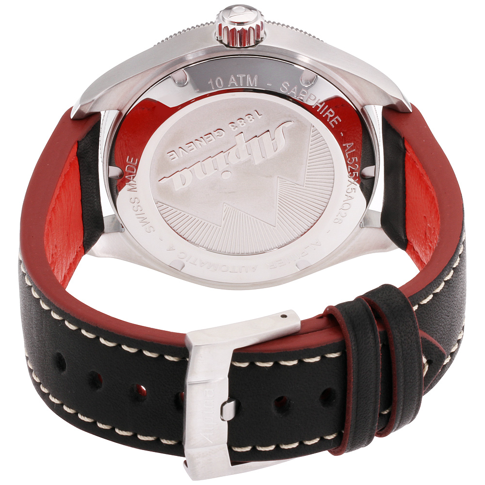 Alpina Alpiner 4 Black Dial Leather Strap Men's Watch AL525BR5AQ6. 44 mm stainless steel case with a black bi-directional turning bezel. A black sunray dial with a scratch resistant convex sapphire crystal. Silver tone luminous hands and index hour markers. Red minute markers around the outer rim. Date at 3 o’clock. Anti-magnetic. Anti-shock. Hands: hours, minutes, and seconds. Case thickness of 14 mm. Screw down crown. 22 mm black leather strap with red lining. Buckle clasp. Automatic movement and water resistant up to 100 meters. Style: sport watches. Alpiner series.