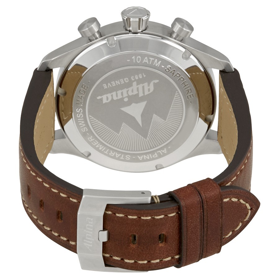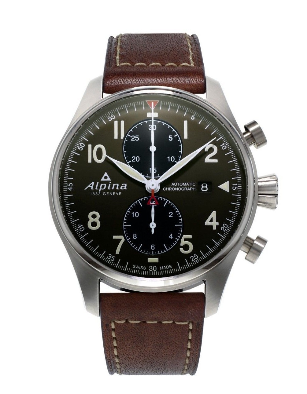 | Alpina Startimer Pilot Collection. Silver-tone stainless steel case with a brown leather strap. Fixed silver-tone stainless steel bezel. Matte military green dial with silver-tone hands and Arabic numeral hour markers. Minute markers around the outer rim. Dial Type: Analog. Luminescent hands and markers. Date display at the 3 o'clock position. Two- 30 minutes, and 12 hours subdials. Alpina Calibre automatic movement. Scratch resistant sapphire crystal. Screw down crown. Case size: 44 mm. Round case shape. Band width: 22 mm. Water resistant at 100 meters / 330 feet. Functions: chronograph, date, hour, minute, second. Watch label: Swiss Made. | |