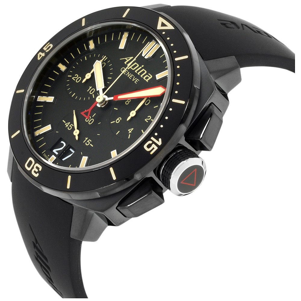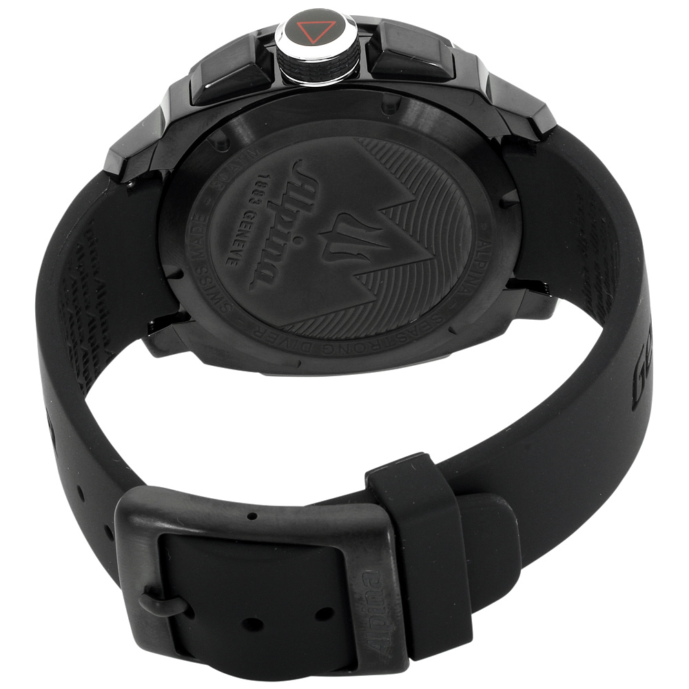 Alpina Seastrong Diver 300 Black Dial Silicone Strap Men's Watch AL-372LBBG4FBV6. 44 mm black PVD coated stainless steel case with a unidirectional rotating, diving bezel. A black dial with a scratch resistant sapphire crystal. Grey luminous hands and index hour markers. Minute markers around the outer rim. Big date at 6 o'clock. Logo beneath the 12 o'clock position. Chronograph. Hands: hours, minutes, and seconds. Case thickness of 14 mm. Screw down crown. 22 mm black silicone strap with a buckle clasp. Quartz movement and water resistant up to 300 meters. Style: diving watches. Seastrong Diver 300 series.