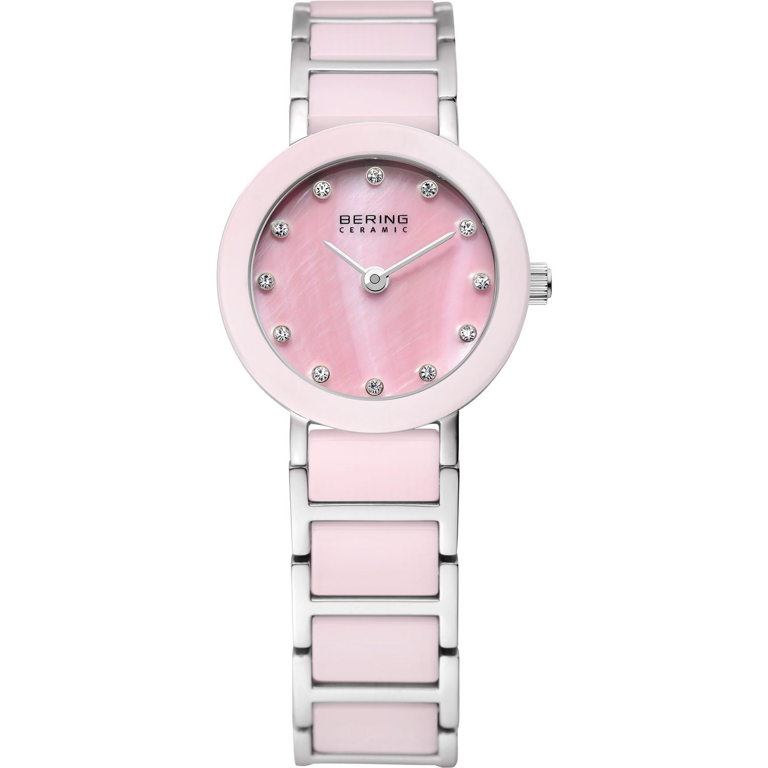 This stylish Bering Time women's watch offers a bold with special details. The round-shaped, pink dial features silver-tone hands. It's framed by a pink ceramic bezel and sturdy case while the pink and silver-tone stainless steel bracelet is secured with a fold over clasp for added safety. This analog quartz powered timepiece is protected by a scratch resistant synthetic sapphire crystal and is water resistant up to 164 feet (50 meters) and offers a battery life of approximately three years. It is backed by a 3-year limited manufacturer's warranty.