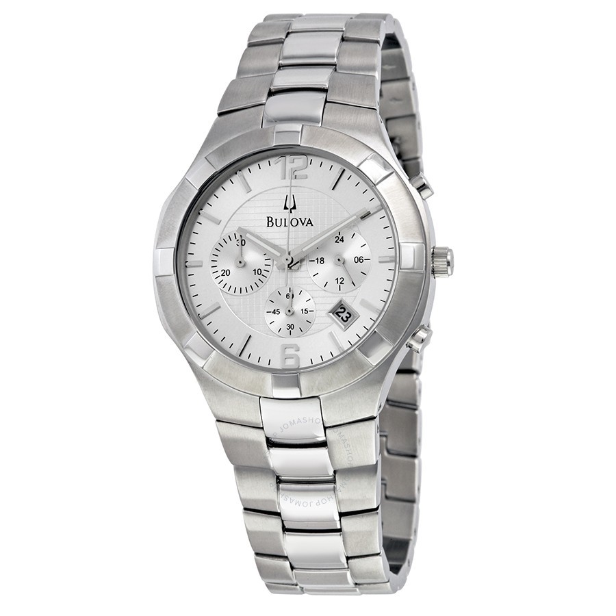 | Chronograph functionality. Quartz battery movement. Date display window. Silver-tone stainless steel case and bracelet. | |