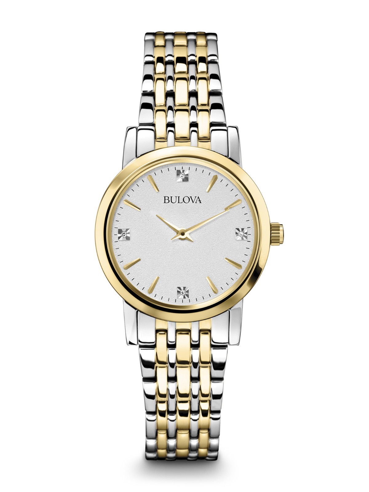 | From the Bulova Diamonds Collection. In stainless steel with two-tone finish, 4 diamonds individually hand-set on silver-white patterned dial, and locking fold-over clasp and water resistance to 30 meters. | |