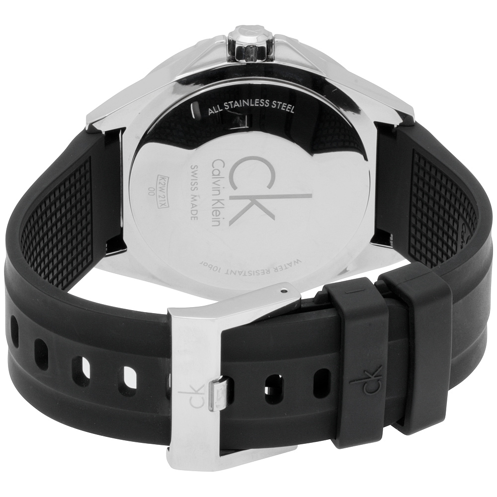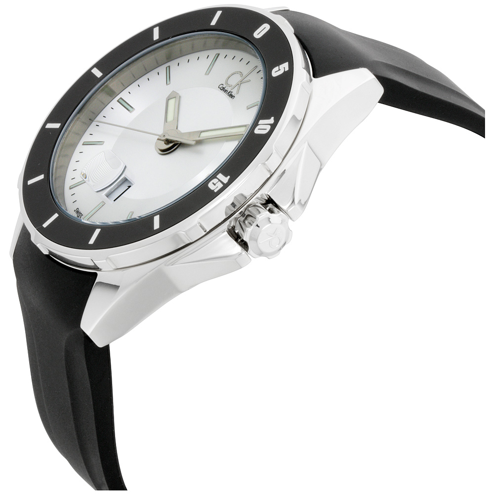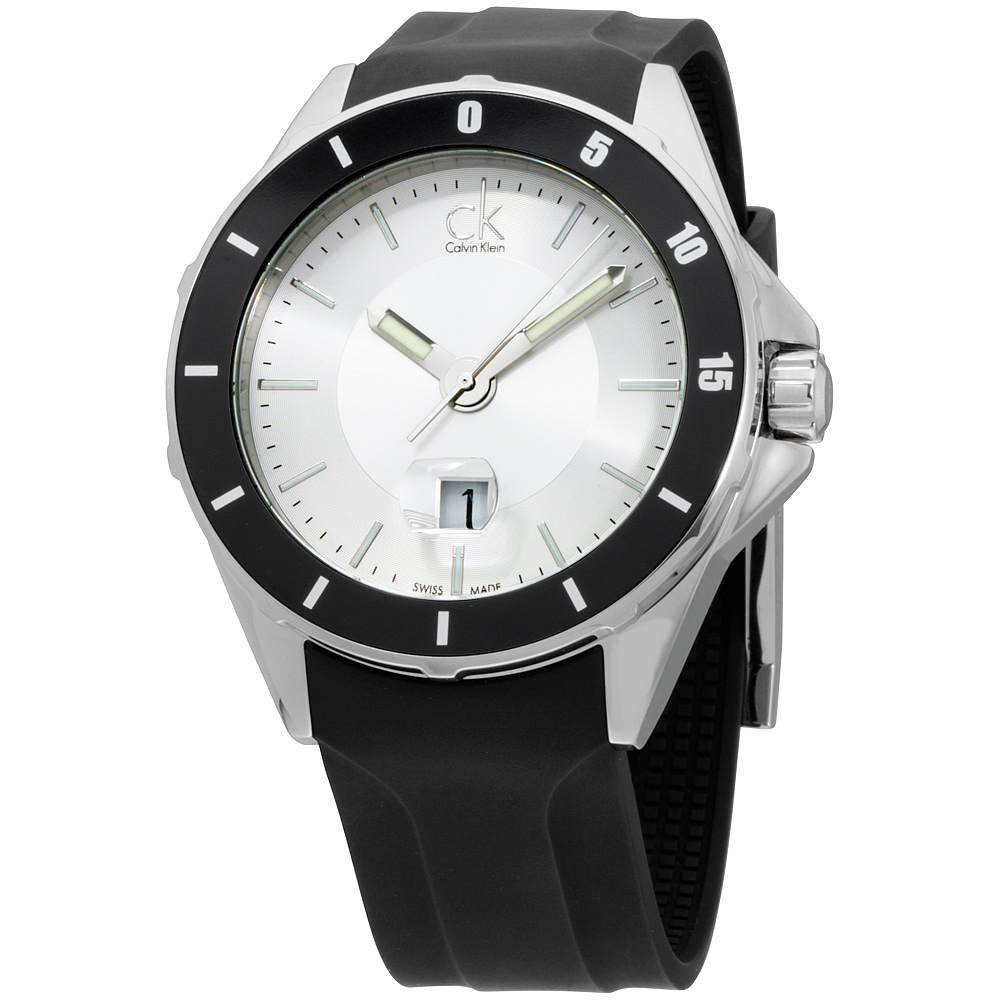 Calvin Klein Play Silver Dial Silicone Strap Men's Watch K2W21XD6. 44 mm stainless steel case with a black minutes scale bezel. A silver dial with a mineral crystal. Silver tone luminescent hands and index hour markers. Minute markers around the outer rim. Big date at 6 o'clock. Logo at 12 o'clock. Hands: hours, minutes, and seconds. Case thickness of 12 mm. Push / pull crown. 22 mm black silicone strap with a buckle clasp. Quartz movement and water resistant up to 100 meters. Style: casual watches. Play series.