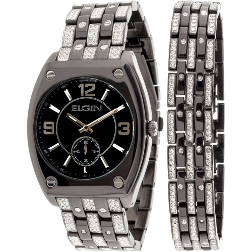 Elgin Men’s Crystal Accented Ionic Watch and Matching Bracelet, Black