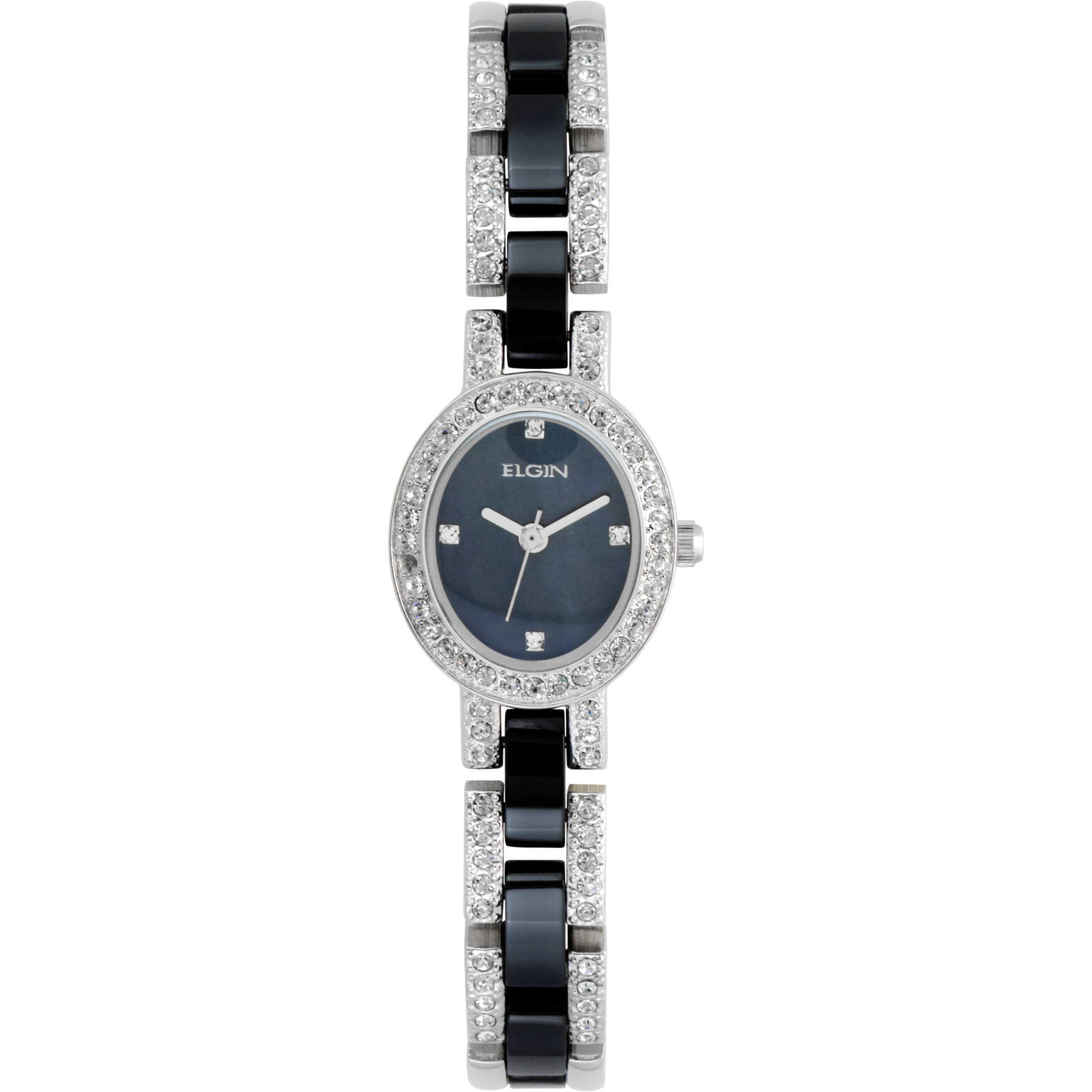 Elgin Women’s Two-Tone Silver and Black Ceramic Black Dial Czech Crystal Accented Bracelet Watch