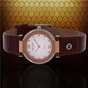 At points between noon and six, 10 brilliant-cut diamonds mark the hour with their undeniable brilliance. The case is a mix of polished and brushed stainless steel with a polished rose-gold bezel, and the strap is genuine leather emblazoned with a signature BS metal grommet.