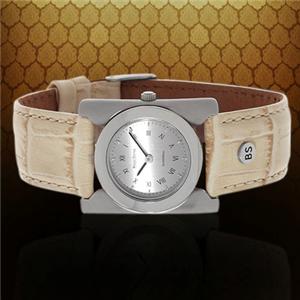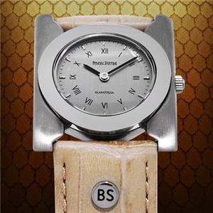 The case is brushed stainless steel with a shiny bezel, and the bone white genuine leather strap features the embossed signature BS metal grommet.