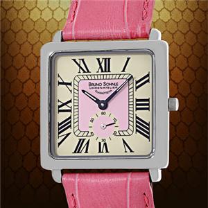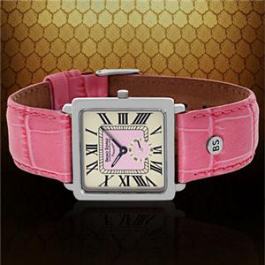 The case is polished stainless steel, and the pink genuine leather strap features the embossed signature BS metal grommet.