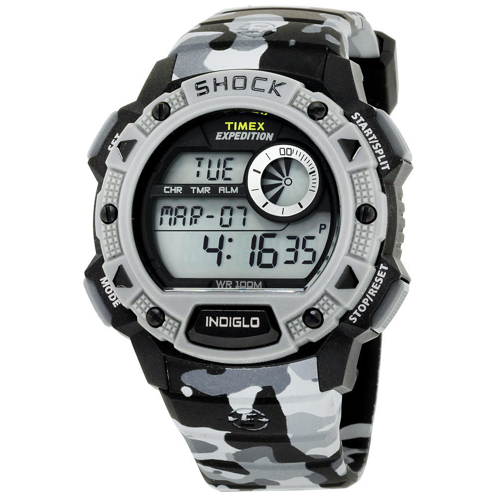 Timex Expedition Base Shock Grey Dial Resin Strap Men's Watch TW4B00600. 45 mm grey resin case with a grey dial and a mineral crystal. Digital dial display: hours, minutes, seconds, day, date, and month. Logo at the 12 o'clock position. Indiglo night-light. Shock resistant. Chronograph. Alarm. Timer. Case thickness of 16 mm. Push / pull crown. 22 mm grey camo resin strap with a buckle clasp. Quartz movement and water resistant up to 100 meters. Style: sport watches. Expedition series.